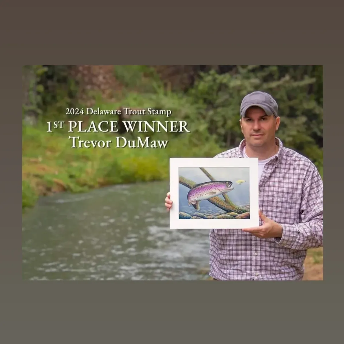 Following his military service, Trevor redirected more of his time and energy towards his art. Over time, his artist portfolio expanded as his unique style continued to evolve. Trevor developed a keen interest in hunting and fishing-related stamp contests. He started entering state-level stamp contests, and after a few unsuccessful attempts, Trevor received the call he had been hoping for. In 2023, he secured 1st Place/Best in Show in the 2024 Delaware Trout Stamp Contest.