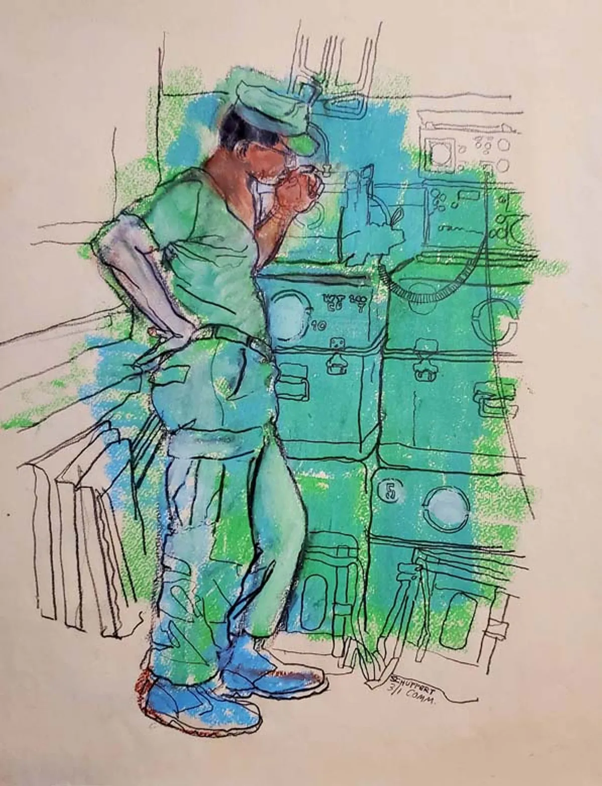 Radio Equipment Room, oil pastel & graphite, Vietnam