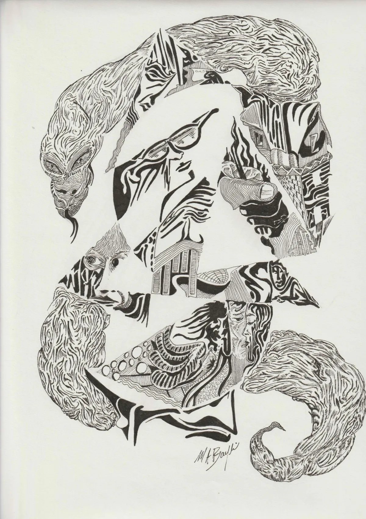 Ink drawingBlack and whiteSurrealAbstractFragmentedPatternLine artAbstractBold / GraphicDark / DramaticExpressionism / EmotionalStorytelling / NarrativeContemporary / ModernPortrait / PeopleAbstract / ConceptualSurreal / Imaginative