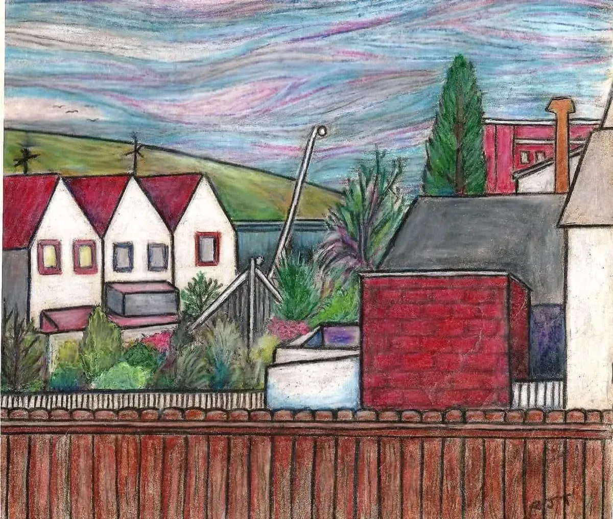 Residential sceneFolk artVibrant colorsSkyscapeWooden fenceHillsArchitectural elementsExpressionism / EmotionalBold / GraphicStorytelling / NarrativeLandscape / NatureCity / Architecture