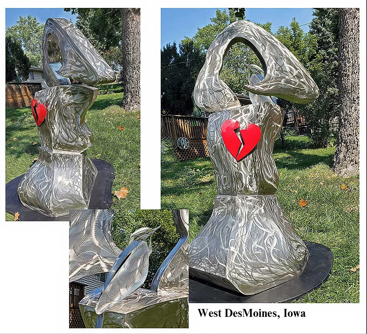 abstract sculpturemetallic artbroken heartbirdoutdoor installationpublic artsymbolismAbstractContemporary / ModernStorytelling / NarrativeExpressionism / EmotionalAbstract / ConceptualSpiritual / SymbolicConflict / SacrificeHope / Healing / Resilience