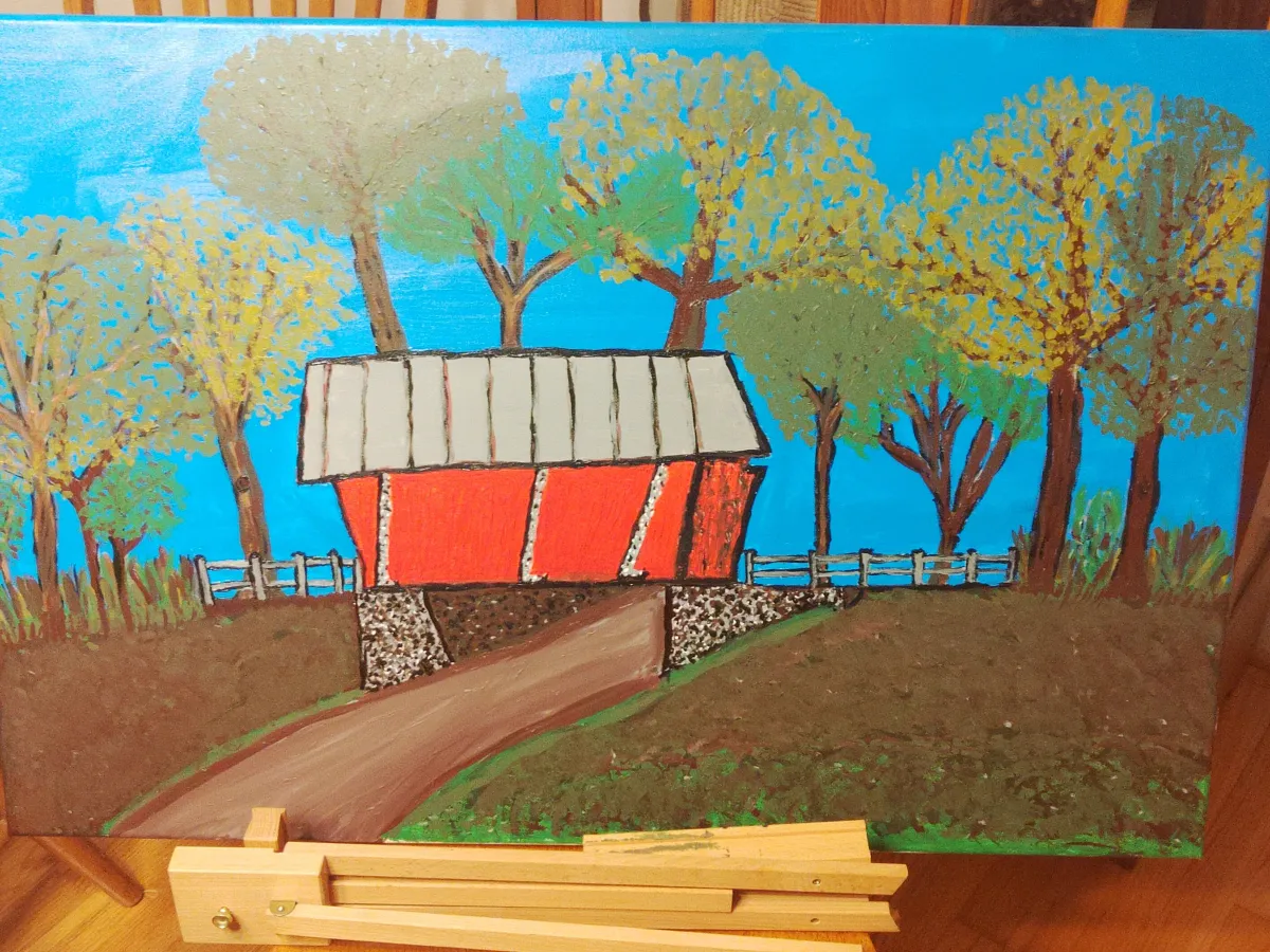 covered bridgelandscape paintingrural scenefoliagered bridgeblue skycountrysideRealismStorytelling / NarrativeLandscape / NatureHistorical / Cultural