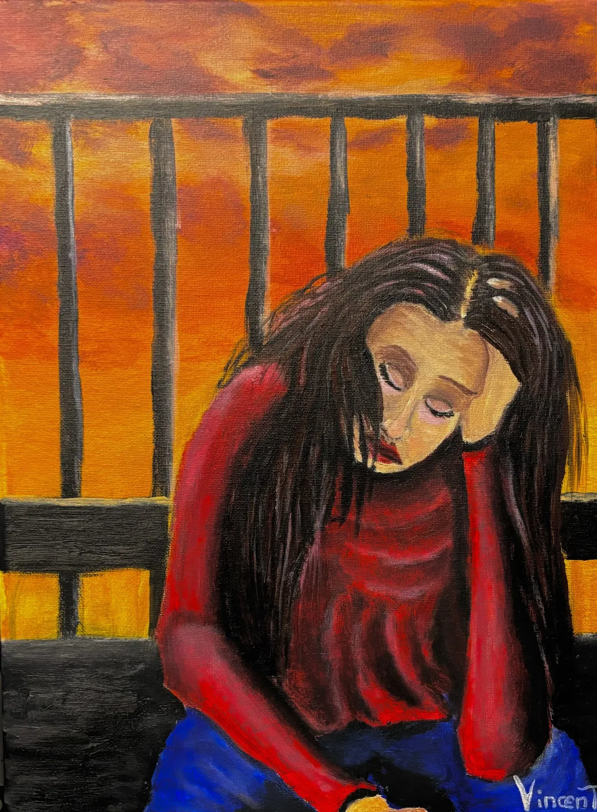 portraitemotionalsomberbarssunsetoil paintingconfinementExpressionism / EmotionalStorytelling / NarrativeDark / DramaticRealismPortrait / PeopleSpiritual / SymbolicConflict / SacrificeTherapeutic / Reflective