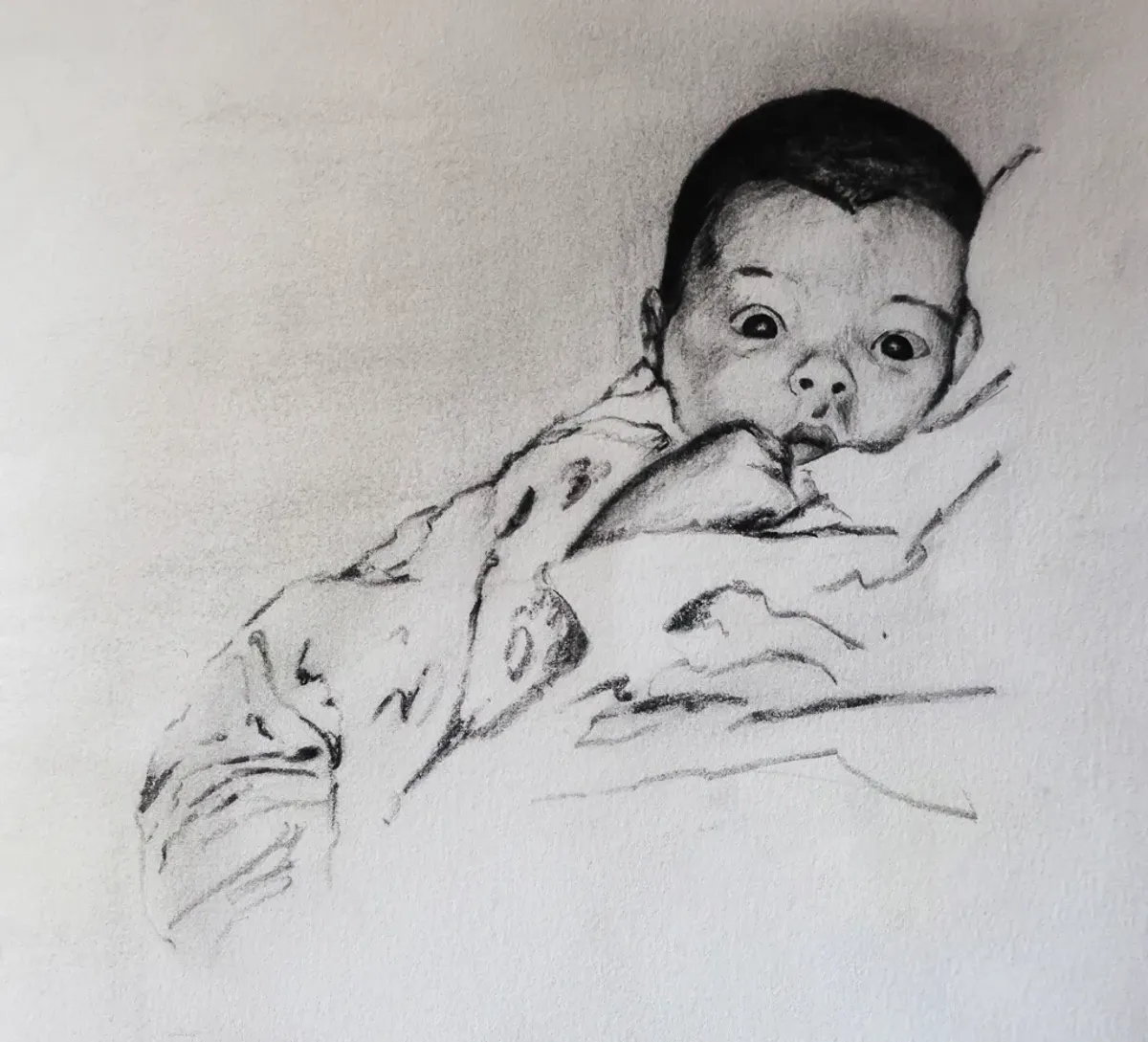 babyinfantcharcoal drawingmonochromeportraitchildsketchRealismDark / DramaticStorytelling / NarrativePortrait / People