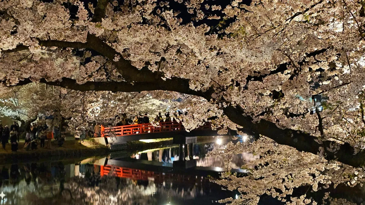 cherry blossomsnight sceneJapanese landscapecanalred bridgefloral illuminationreflectionsRealismDark / DramaticLight / SereneStorytelling / NarrativeLandscape / NatureSeascape / WaterHistorical / CulturalSpiritual / Symbolic