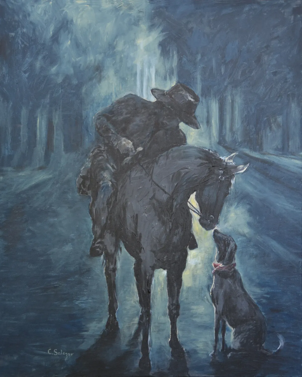 cowboyhorsedogforestnocturnecompanionshipwesternRealismDark / DramaticStorytelling / NarrativeLandscape / NatureAnimals / WildlifeHistorical / CulturalSpiritual / Symbolic