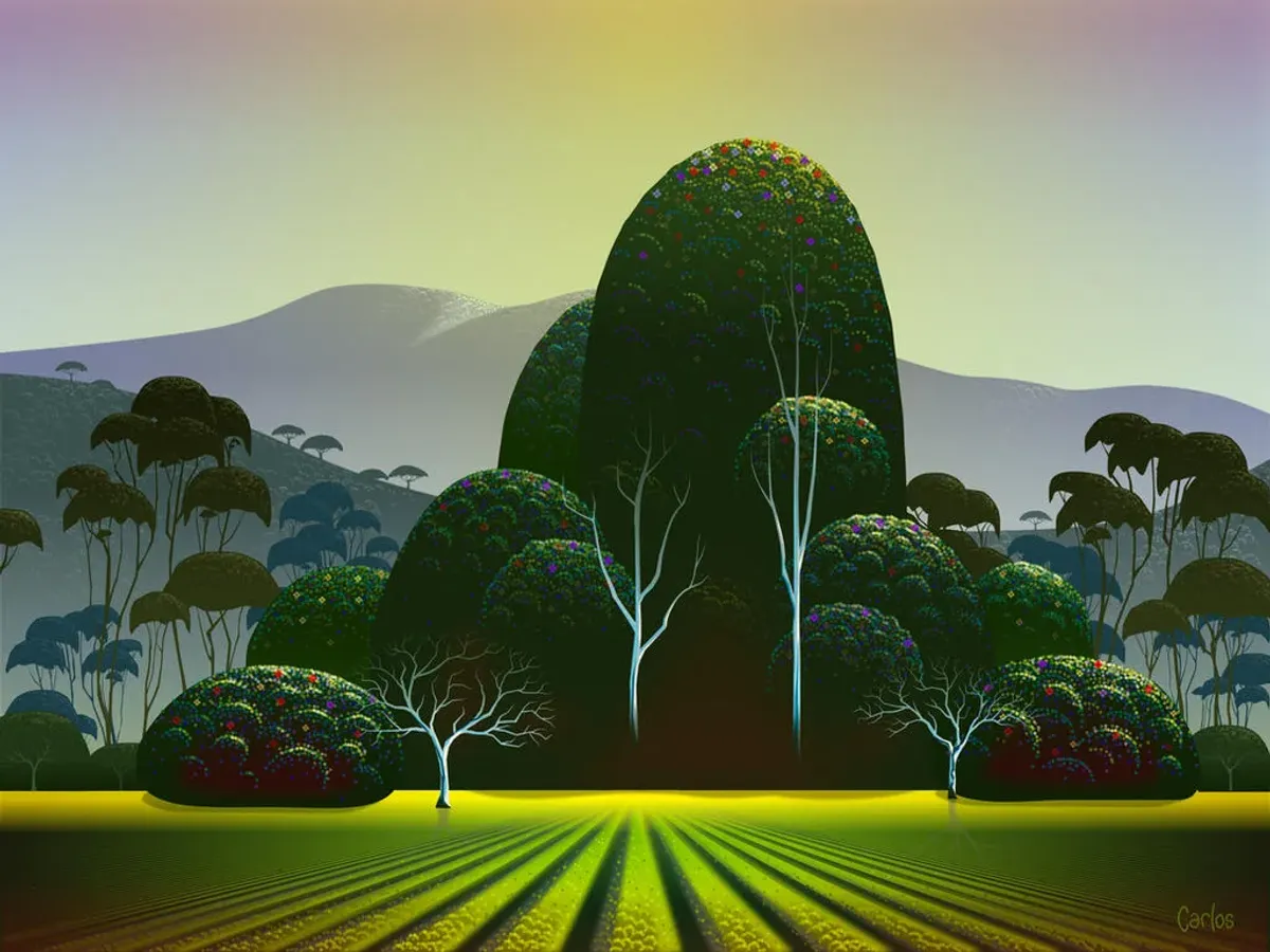 stylized landscapevibrant greensereneabstract treesrolling hillscolorful foliageimaginativeContemporary / ModernBold / GraphicLight / SereneInspirational / UpliftingLandscape / NatureSurreal / ImaginativeHope / Healing / Resilience