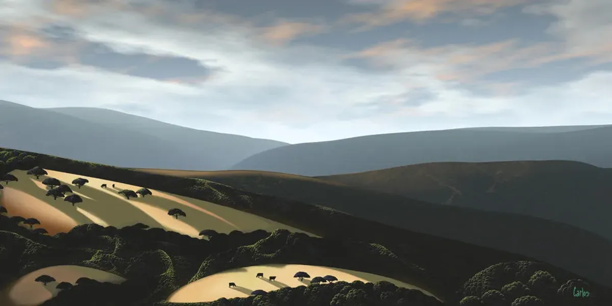 landscapehillssavannatreesanimalsskysunlightRealismLight / SereneContemporary / ModernLandscape / NatureAnimals / Wildlife