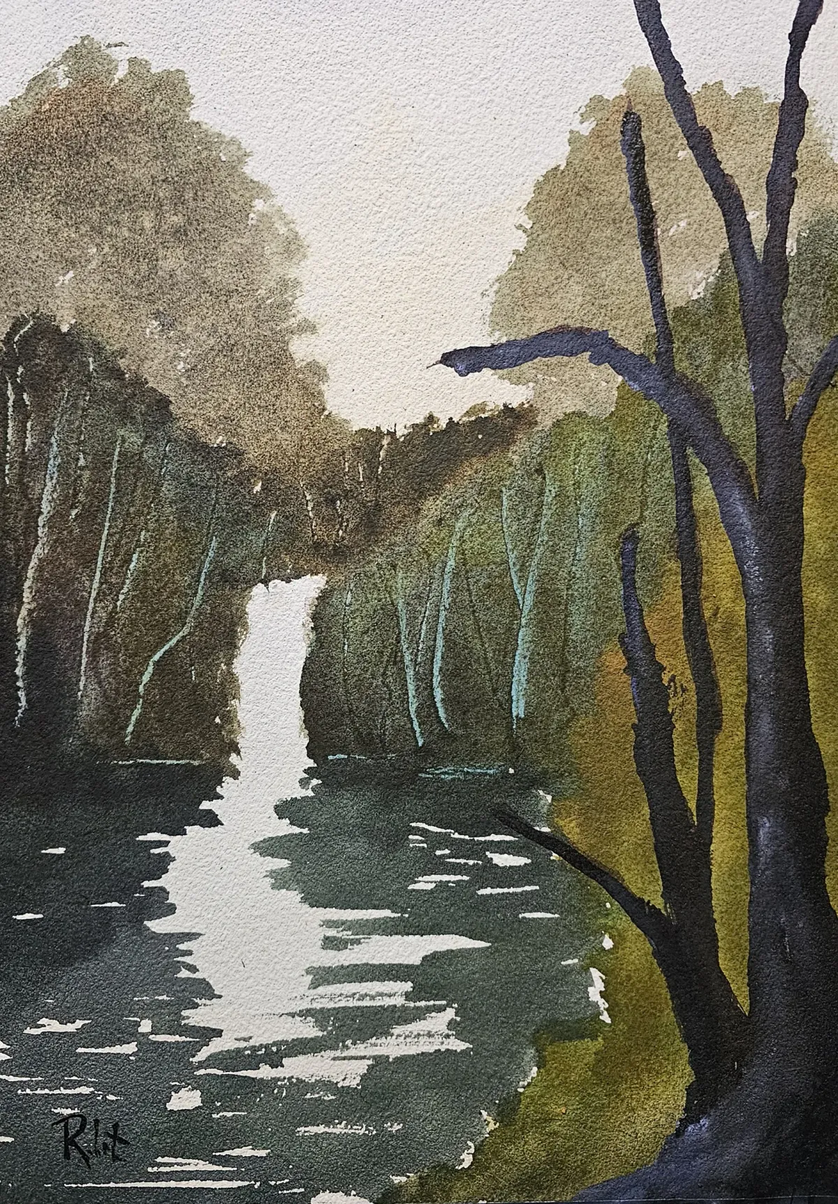 WatercolorLandscapeRiverForestNatureTreeReflectionRealismContemporary / ModernDark / DramaticTherapeutic / ReflectiveLandscape / NatureSeascape / Water