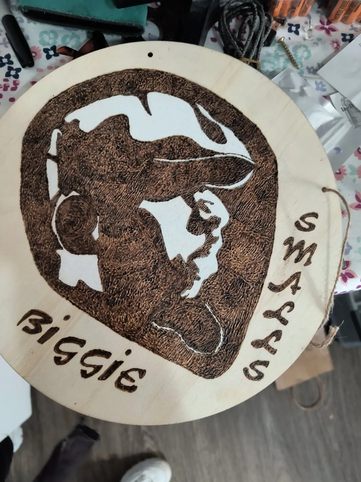 Wood burningpyrographyBiggie Smallssilhouetteportraitwooden plaquehip hop iconContemporary / ModernBold / GraphicStorytelling / NarrativePortrait / PeopleHistorical / Cultural