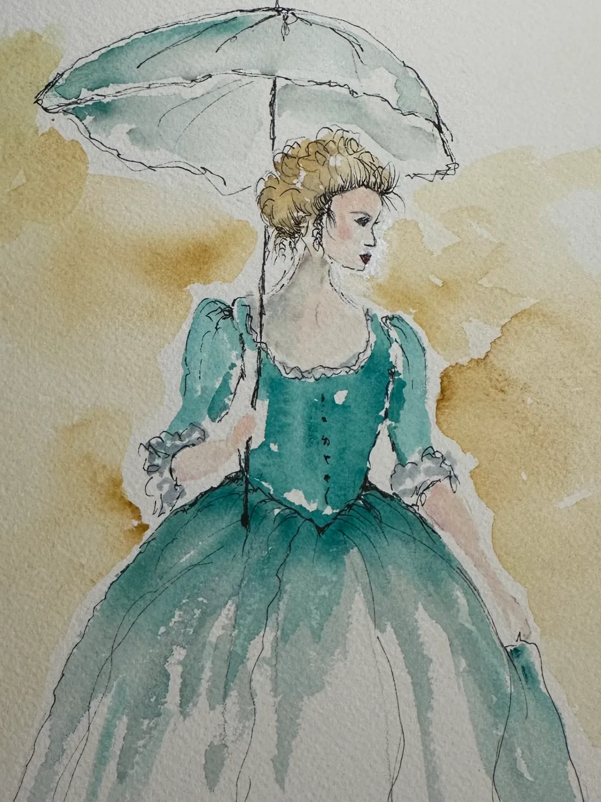 watercolorink sketchhistorical fashionwomanumbrellaturquoise dressportraitRealismContemporary / ModernBold / GraphicStorytelling / NarrativeLight / SerenePortrait / PeopleHistorical / Cultural