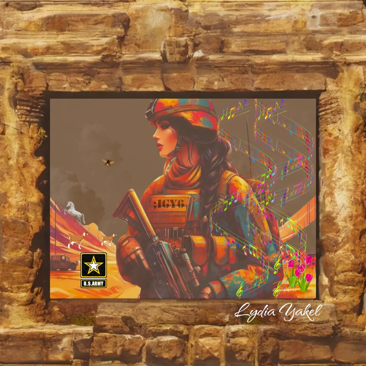 Military womanU.S. ArmyColorful artMusical notesDesert scenePatrioticStylized portraitRealismExpressionism / EmotionalContemporary / ModernBold / GraphicStorytelling / NarrativeInspirational / UpliftingPatriotic / Military / FreedomVeteran Story / ServicePortrait / PeopleHope / Healing / ResilienceConflict / Sacrifice