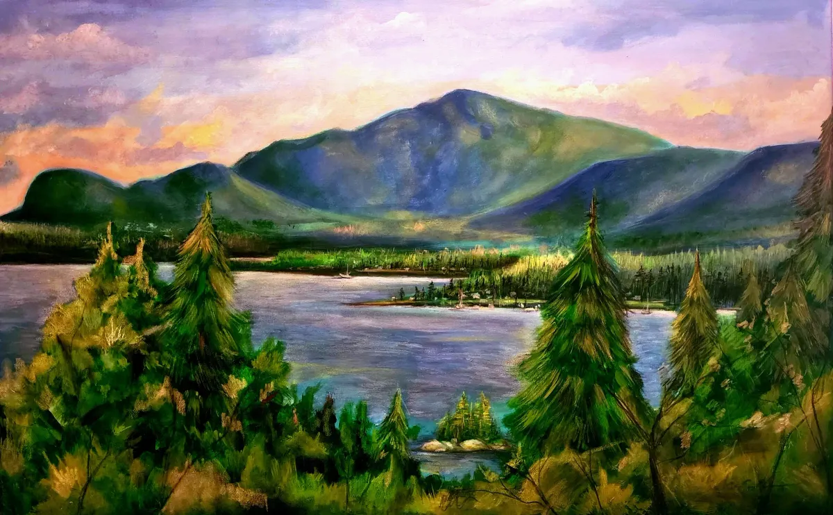 LandscapeLakeMountainsPine TreesSunset SkySailboatsNatureImpressionismLight / SereneInspirational / UpliftingLandscape / NatureSeascape / Water