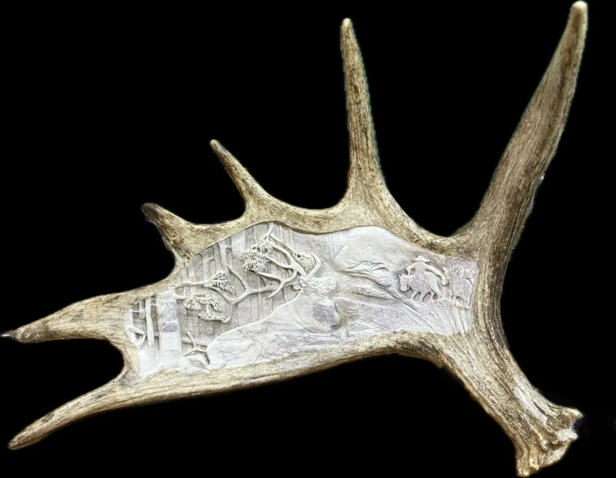moose antlerantler carvingwildlife artrelief carvingnature scenedeercowboyRealismStorytelling / NarrativeLandscape / NatureAnimals / WildlifeHistorical / Cultural