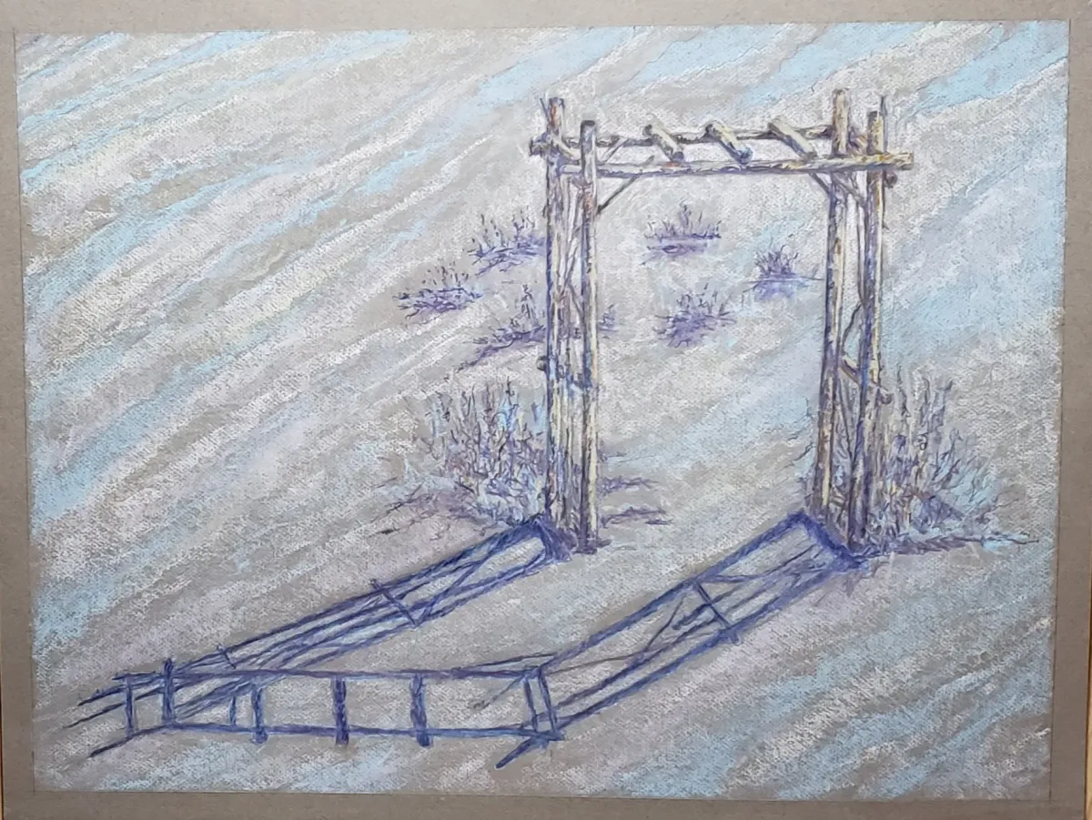 Rustic archwayLong shadowsTextured groundWooden structureExpressive brushstrokesMinimalist landscapeBlue huesExpressionism / EmotionalContemporary / ModernDark / DramaticStorytelling / NarrativeLandscape / NatureSpiritual / Symbolic