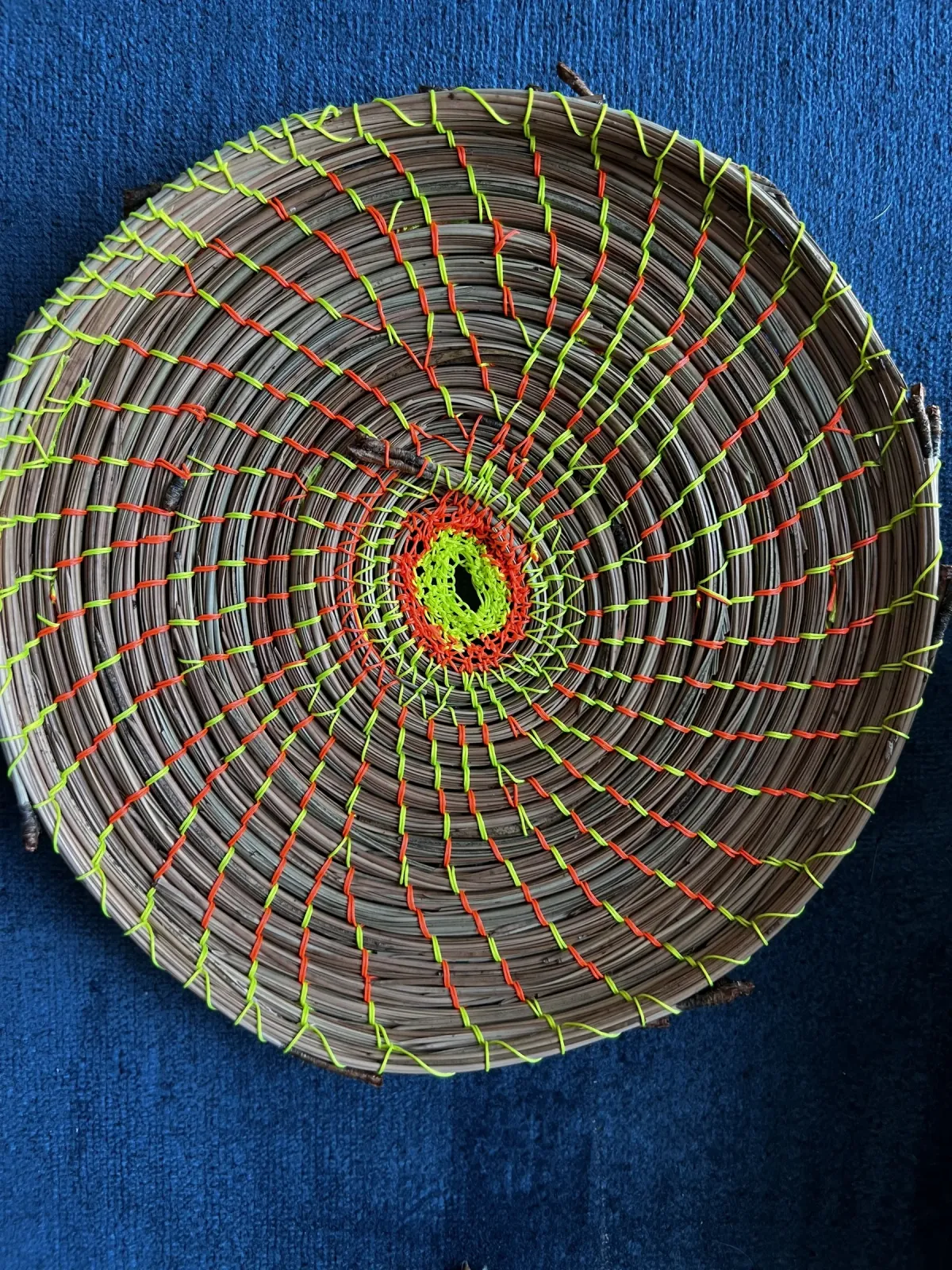 Woven basketnatural craftneon threadsradial patternmodern designhandmade artcircular objectBold / GraphicContemporary / ModernStill Life / ObjectsAbstract / Conceptual