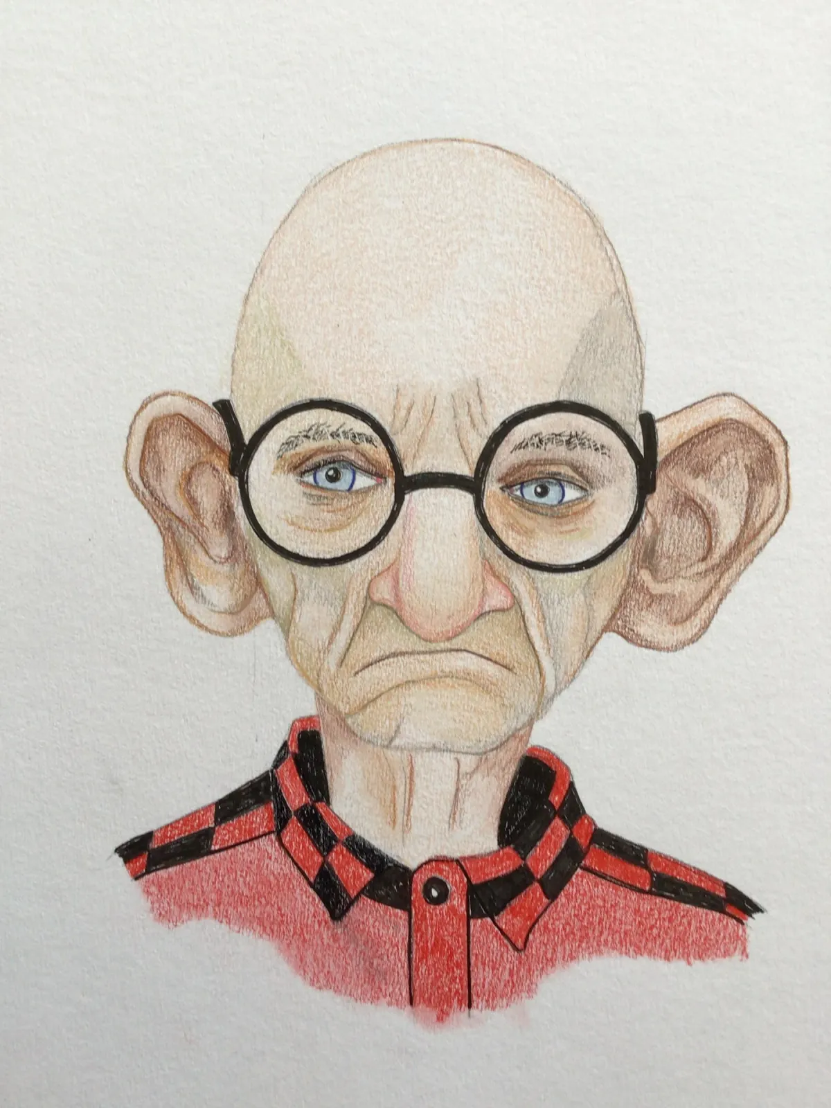 portraitold manglassesexaggerated featurescolored pencilcharactereccentricExpressionism / EmotionalBold / GraphicStorytelling / NarrativePortrait / PeopleHumor / Whimsy