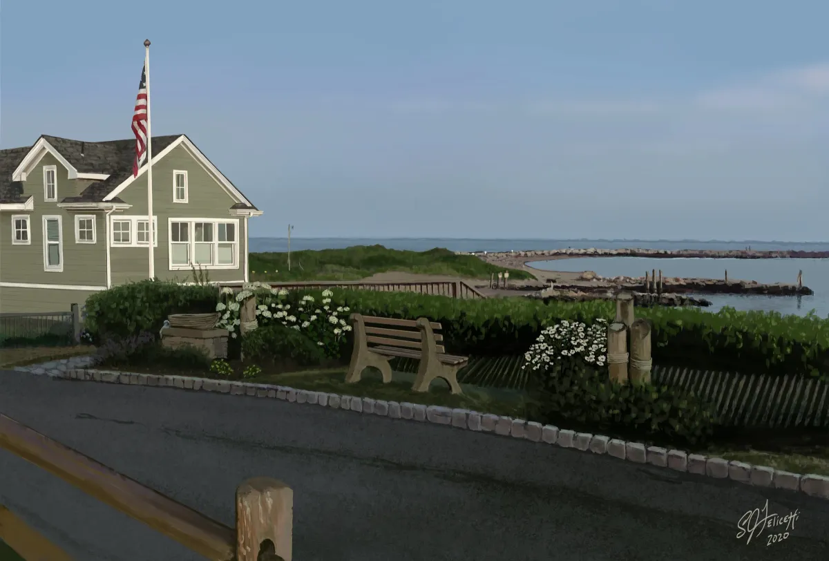 coastalseascapehouseAmerican flaggardenbenchcalmoceanRealismLight / SereneStorytelling / NarrativePatriotic / Military / FreedomLandscape / NatureSeascape / WaterCity / Architecture