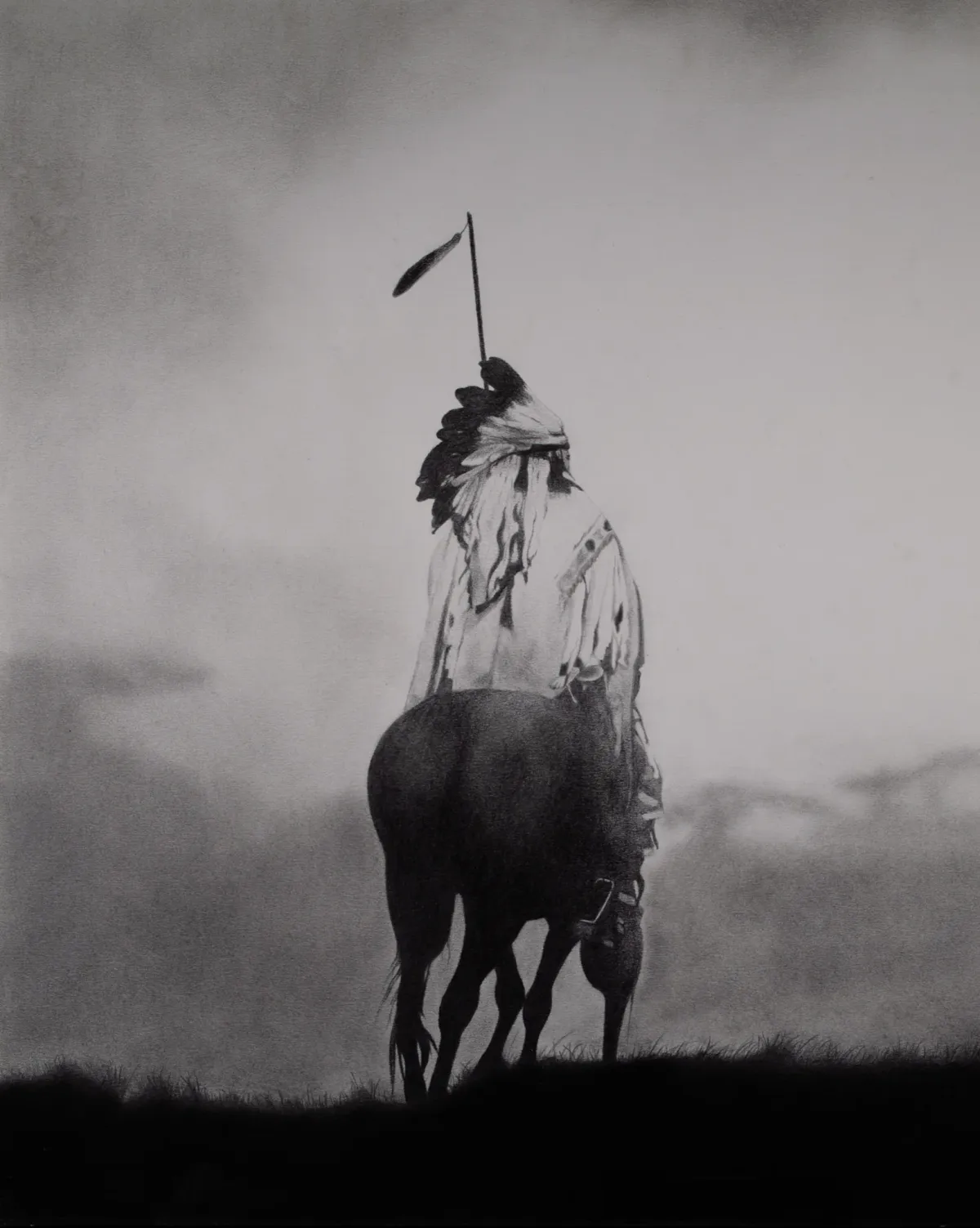 Native Americanhorseback riderheaddressmonochromepencil drawinghistoricallandscapeRealismDark / DramaticStorytelling / NarrativeTherapeutic / ReflectiveLandscape / NaturePortrait / PeopleSpiritual / SymbolicHistorical / Cultural