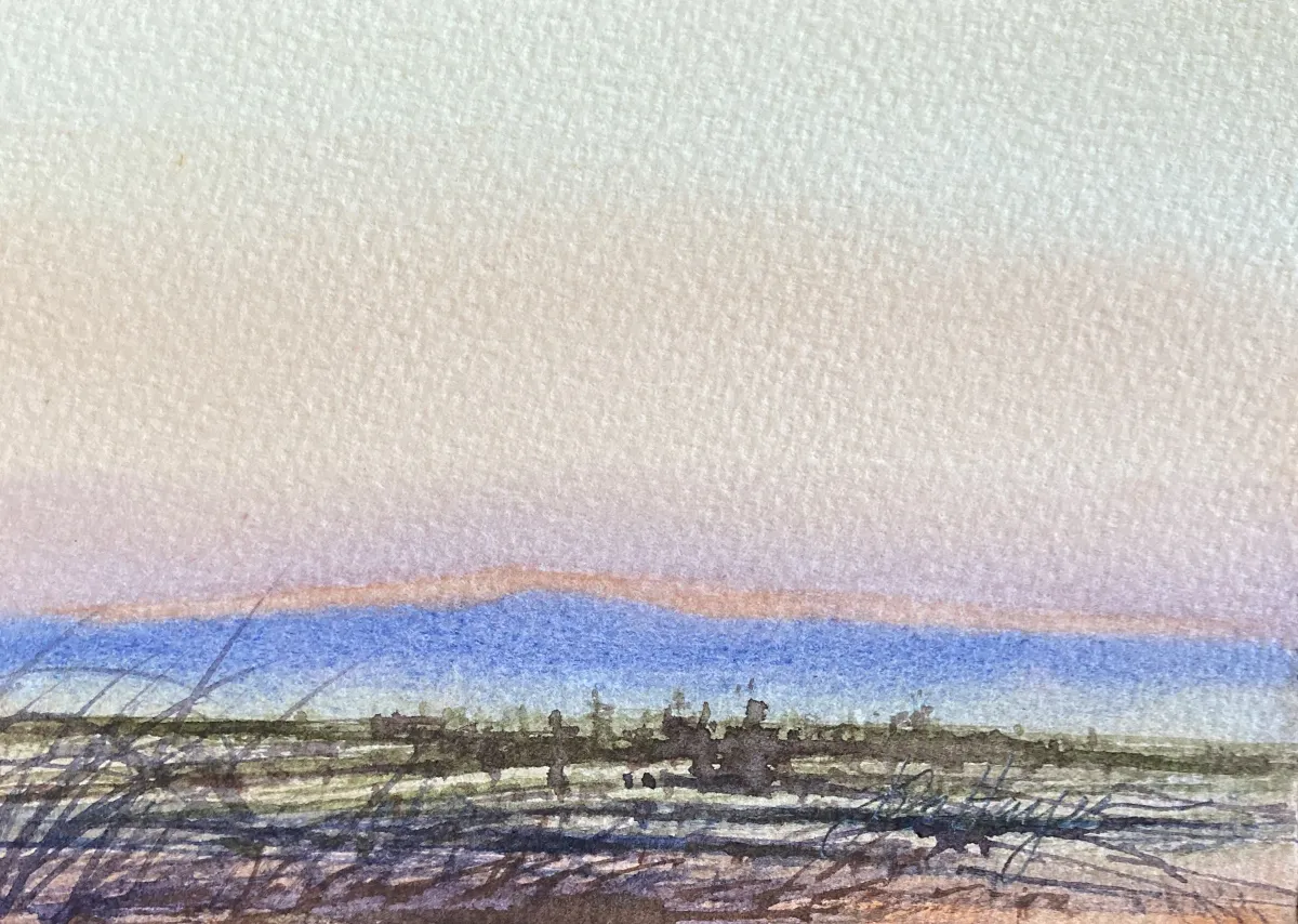 watercolorlandscapemountainsfieldgrassserenesunsetImpressionismLight / SereneStorytelling / NarrativeLandscape / Nature