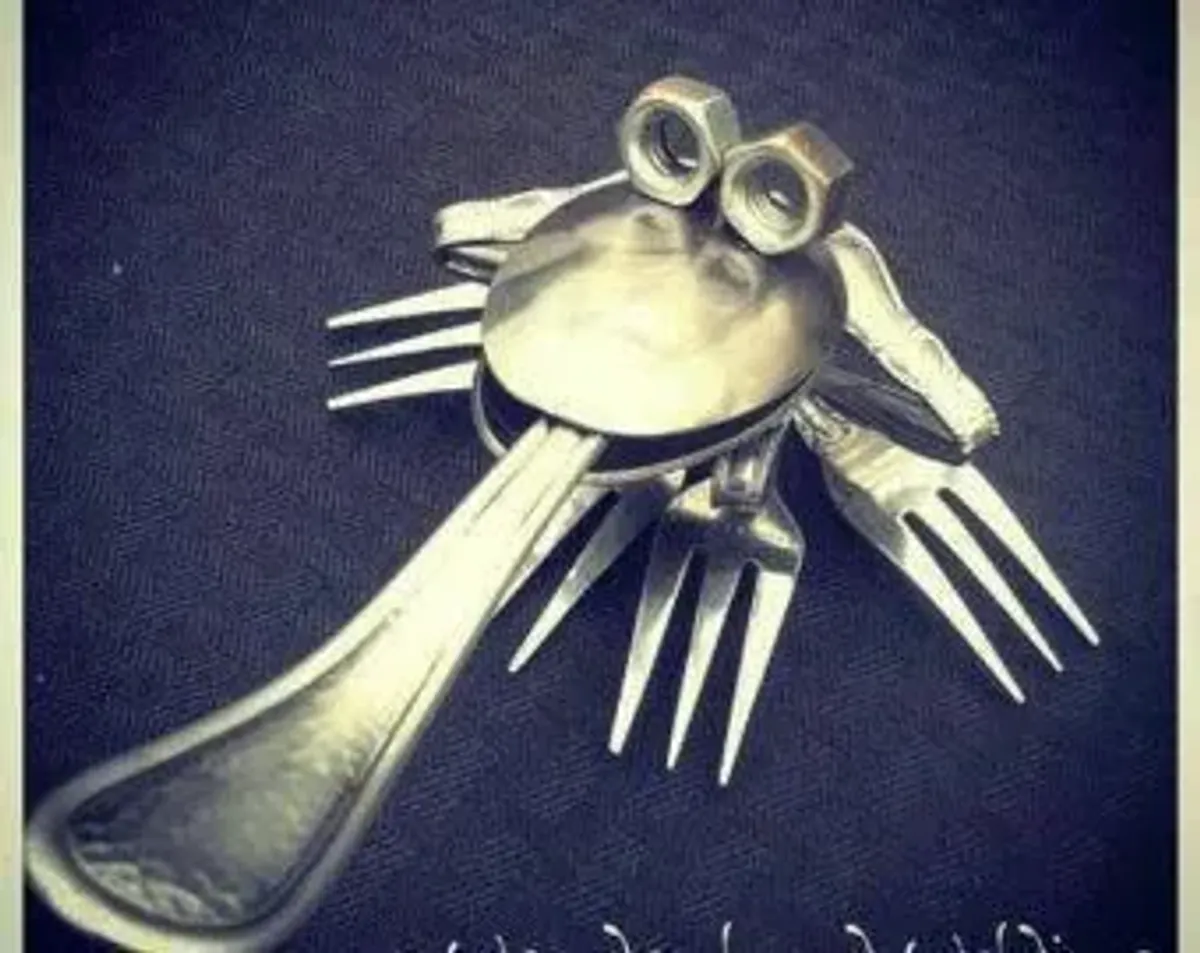 silverware artfrog sculptureupcycled artmetal artcutlery artassemblagewhimsicalContemporary / ModernBold / GraphicInspirational / UpliftingStill Life / ObjectsSurreal / Imaginative