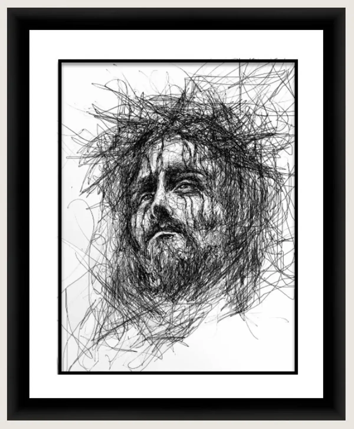 Jesussufferingcrown of thornsscribble artreligiousemotionalmonochromeExpressionism / EmotionalBold / GraphicDark / DramaticStorytelling / NarrativePortrait / PeopleSpiritual / SymbolicHistorical / CulturalConflict / Sacrifice