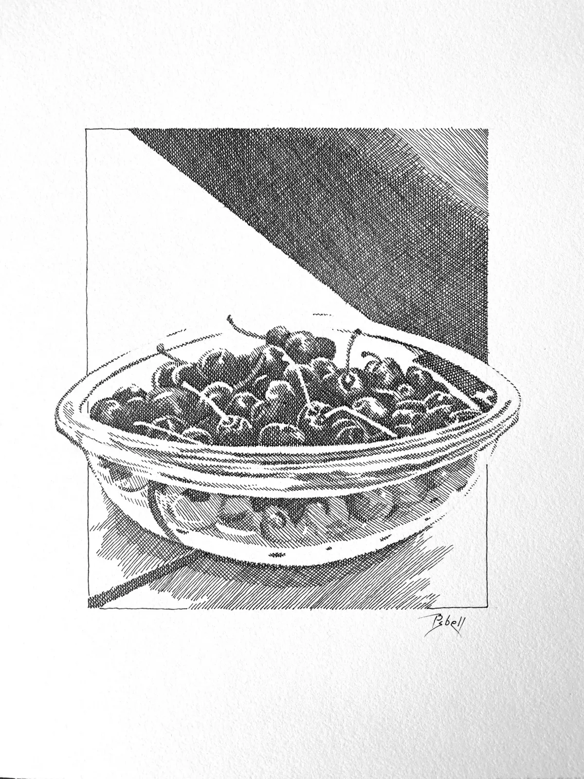 cherriesstill lifepen and inkcross-hatchingmonochromaticfruitdrawingRealismBold / GraphicDark / DramaticStill Life / Objects