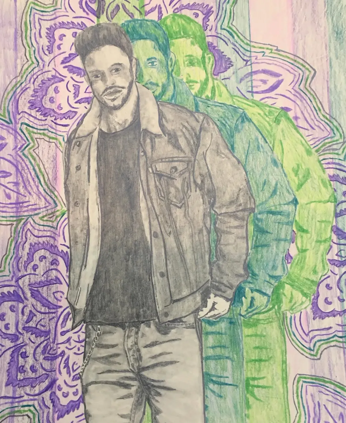 portraitmandenim jacketrepetitionmandalapurplegreenpsychedelicRealismExpressionism / EmotionalContemporary / ModernStorytelling / NarrativeBold / GraphicPortrait / PeopleSurreal / Imaginative