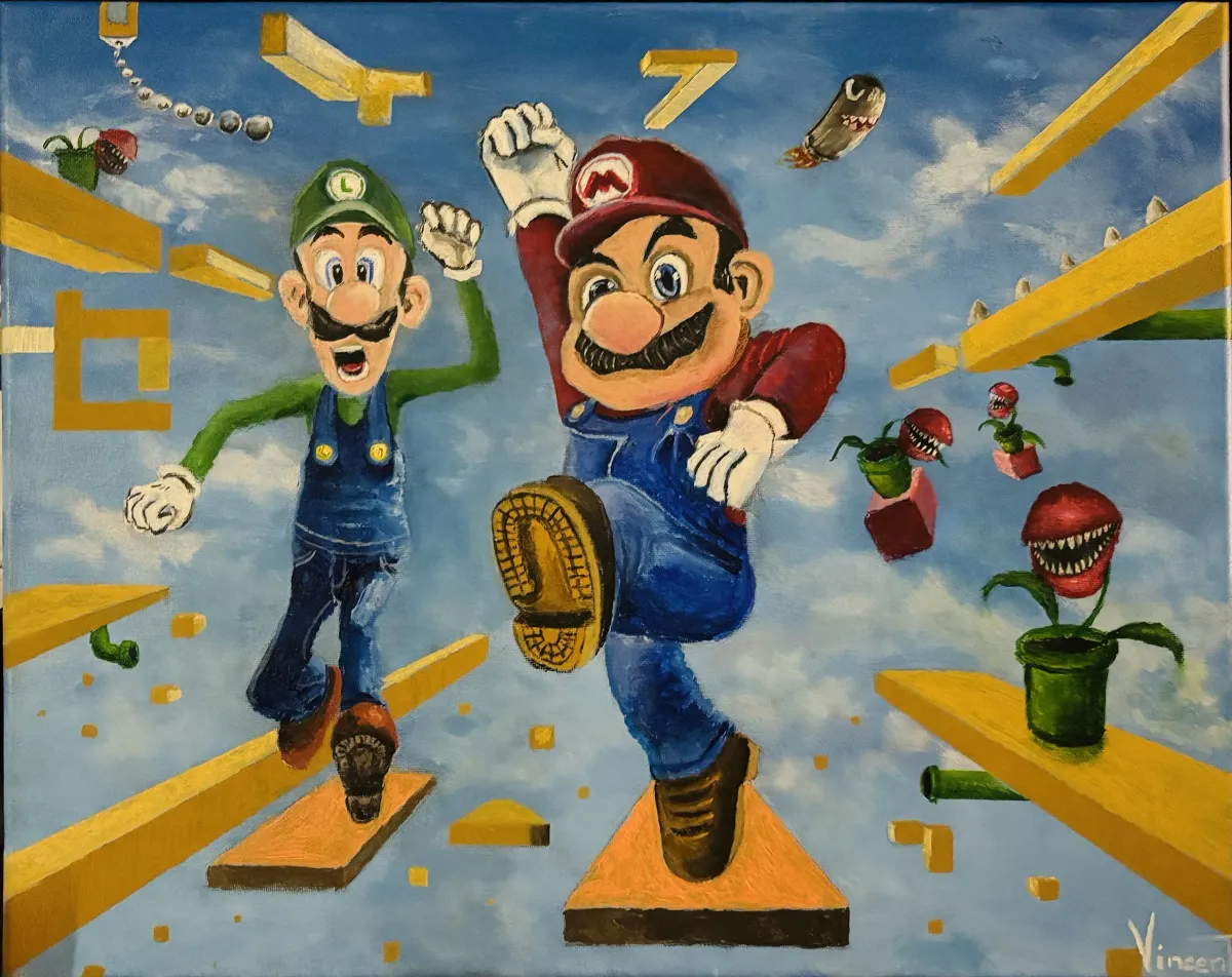 Super Mario Bros.MarioLuigivideo game artPiranha Plantoil paintingcartoonRealismStorytelling / NarrativeBold / GraphicHistorical / CulturalSurreal / Imaginative