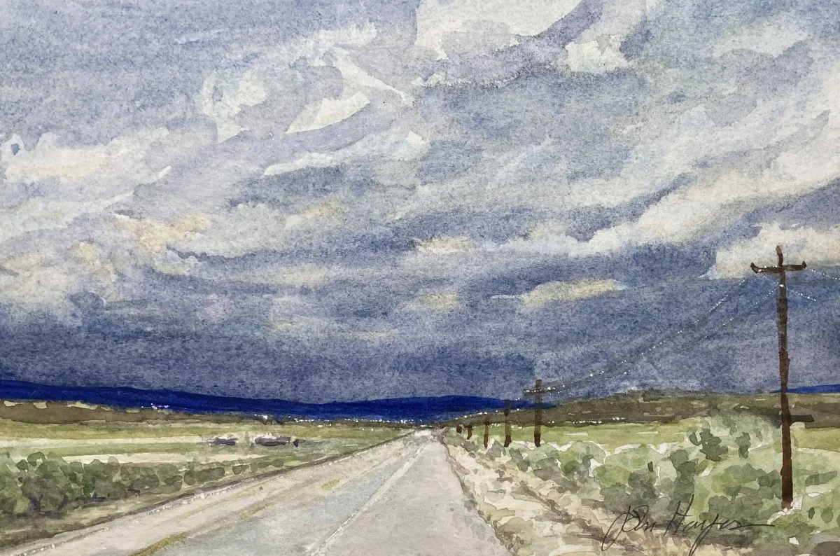 watercolorlandscaperoadcloudy skycountrysidetelephone polesrural sceneRealismLight / SereneTherapeutic / ReflectiveLandscape / Nature