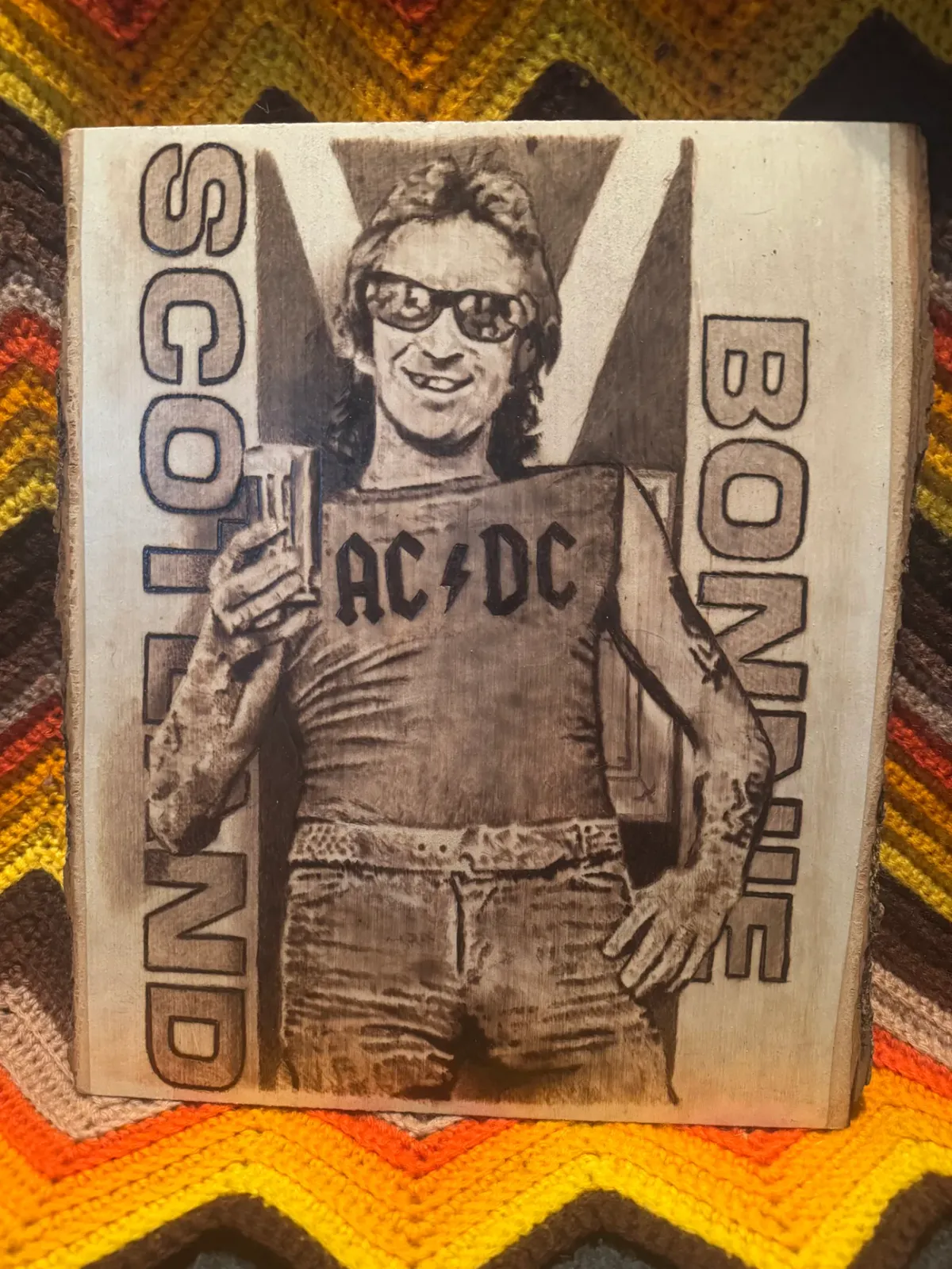 PyrographyWood burningBon ScottAC/DCRock musicPortraitFolk artRealismStorytelling / NarrativeBold / GraphicPortrait / PeopleHistorical / Cultural