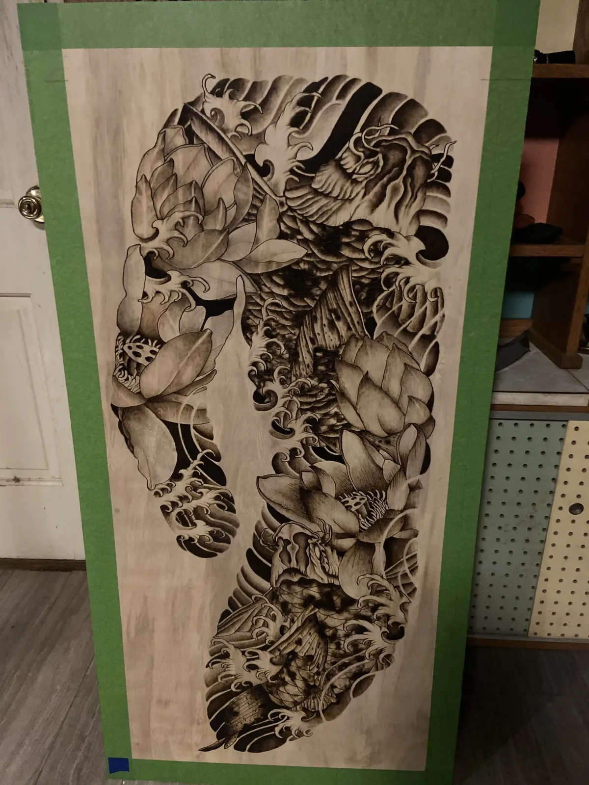 pyrographywood burningJapanese artkoi fishlotus flowerstraditional tattoointricate designRealismBold / GraphicStorytelling / NarrativeDark / DramaticSeascape / WaterAnimals / WildlifeSpiritual / SymbolicHistorical / Cultural