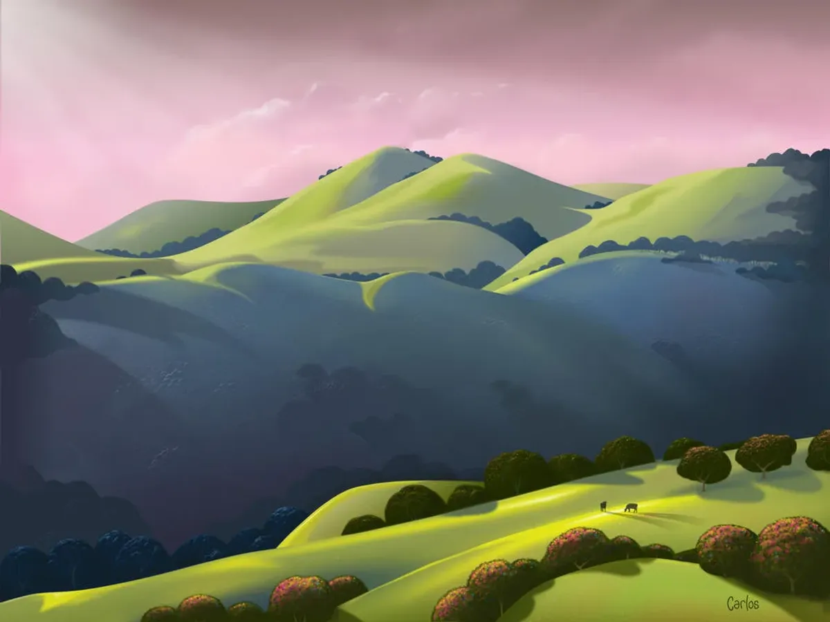 landscapehillspink skysunsetstylizednaturepastoralRealismContemporary / ModernLight / SereneInspirational / UpliftingBold / GraphicLandscape / Nature