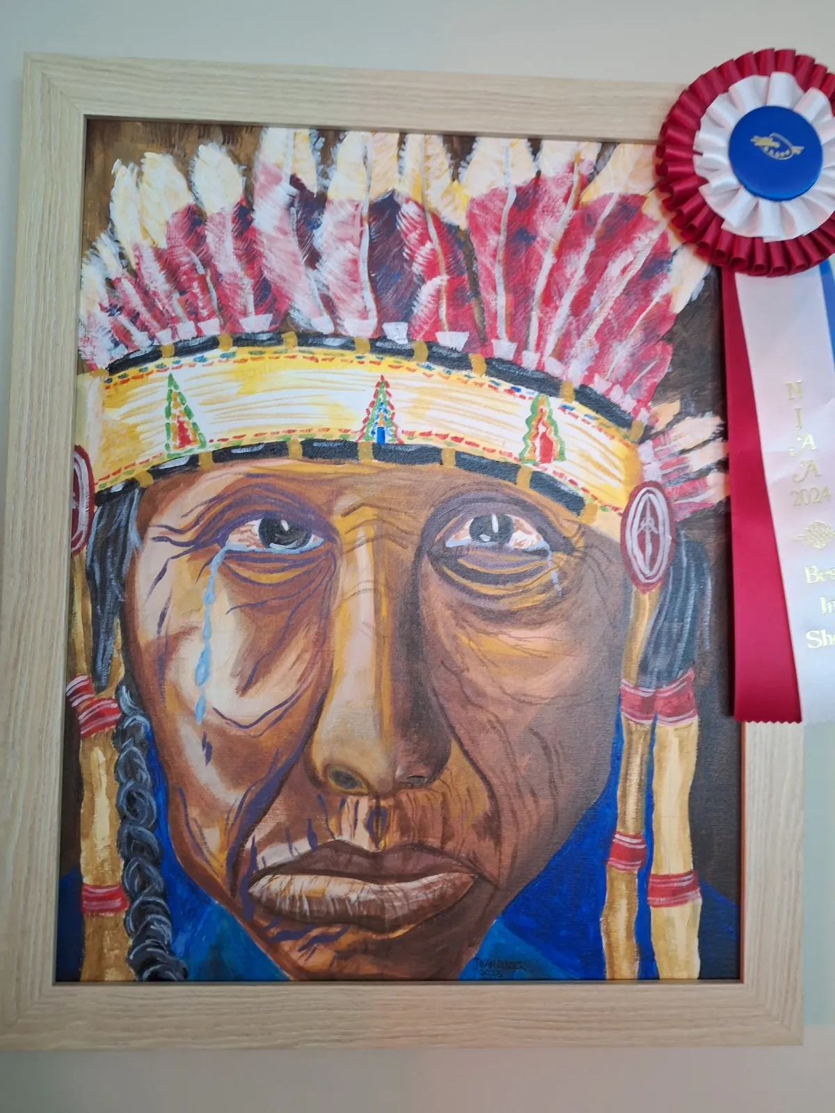 Indigenous portraitfeathered headdressemotional artNative Americanacrylic paintingcultural imagerytearsRealismExpressionism / EmotionalStorytelling / NarrativePortrait / PeopleSpiritual / SymbolicHistorical / CulturalConflict / Sacrifice