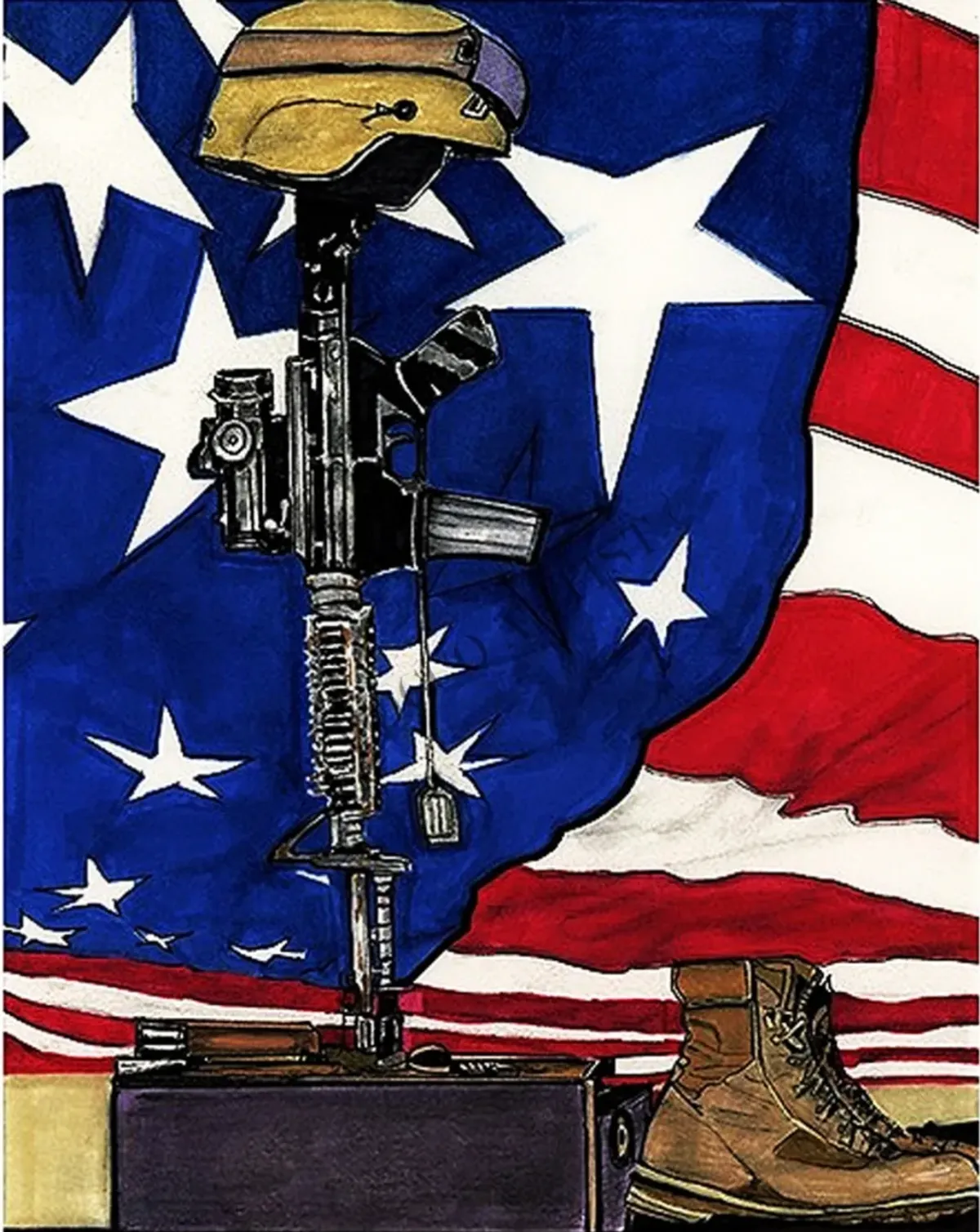 Battlefield CrossMilitary MemorialAmerican FlagFallen SoldierPatriotismSacrificeVeteranRealismStorytelling / NarrativeDark / DramaticInspirational / UpliftingPatriotic / Military / FreedomVeteran Story / ServiceSpiritual / SymbolicConflict / Sacrifice