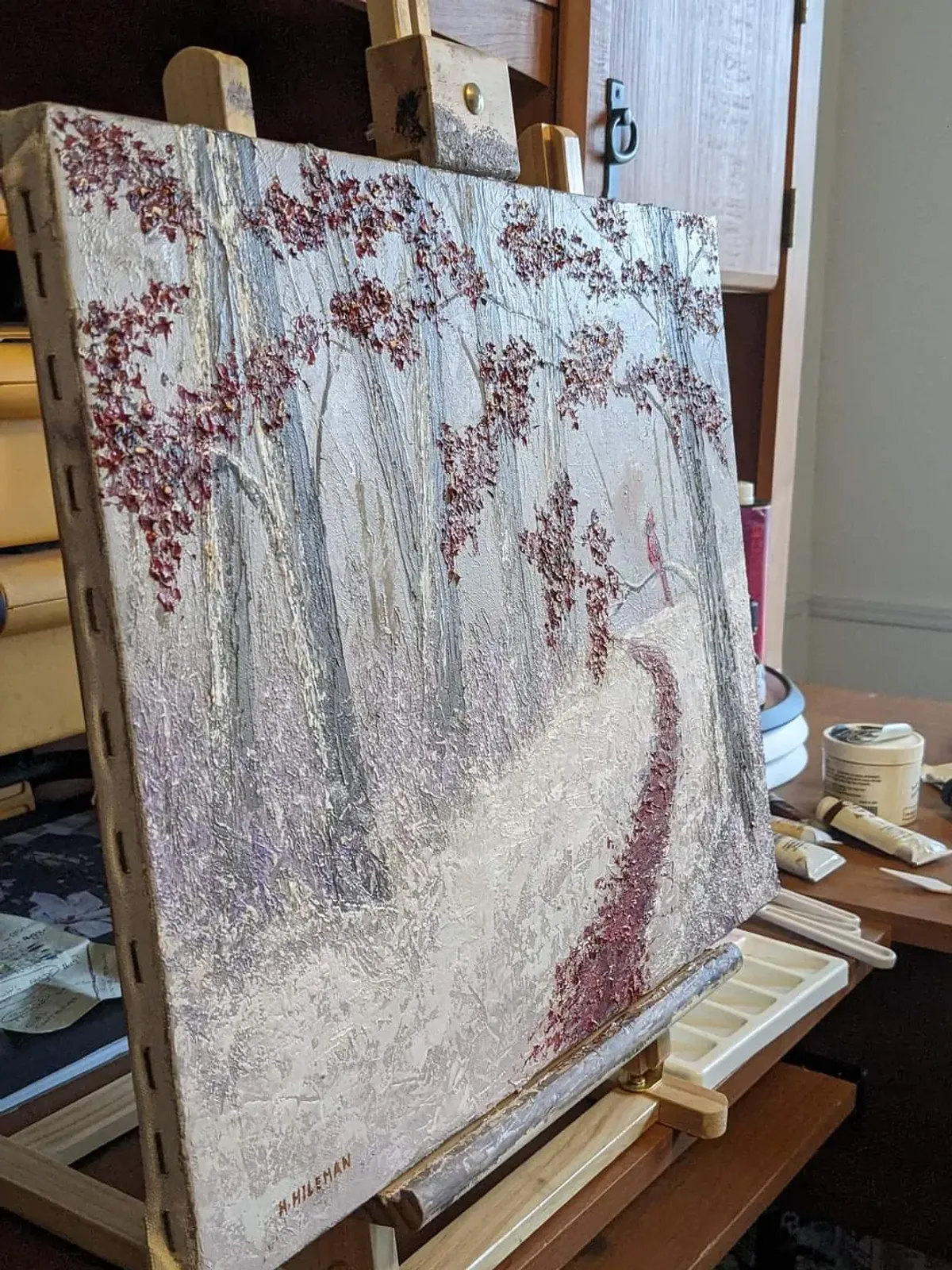 Winter landscapeTextured artForest scenePalette knife paintingRed cardinalSnowy pathImpastoRealismImpressionismContemporary / ModernLight / SereneStorytelling / NarrativeLandscape / NatureAnimals / Wildlife