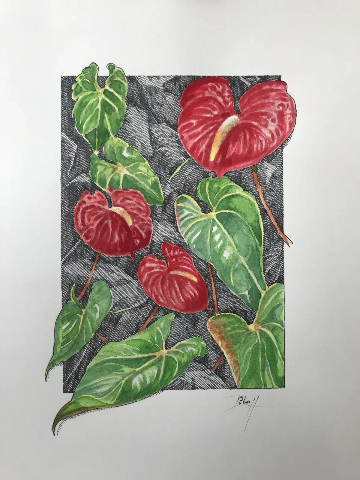 AnthuriumBotanicalWatercolorLeavesHatchingFloralNatureRealismContemporary / ModernBold / GraphicLandscape / Nature
